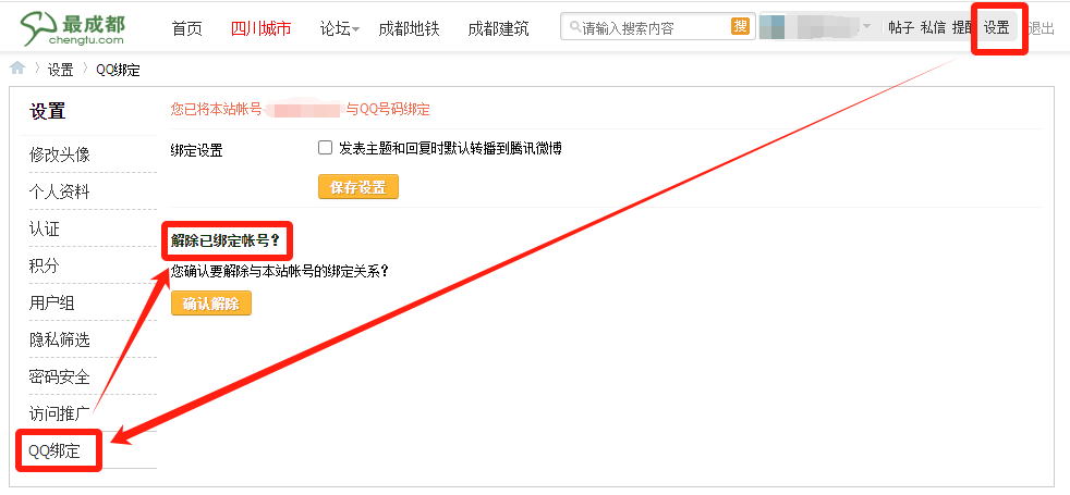 4、QQ登录用户,用密码登录zuicd.co后须在页面右上角点击 “设置/QQ绑定/解除已绑定帐号? ” 解除绑定QQ后,再次重新绑定,之后才能在新域名下QQ登录